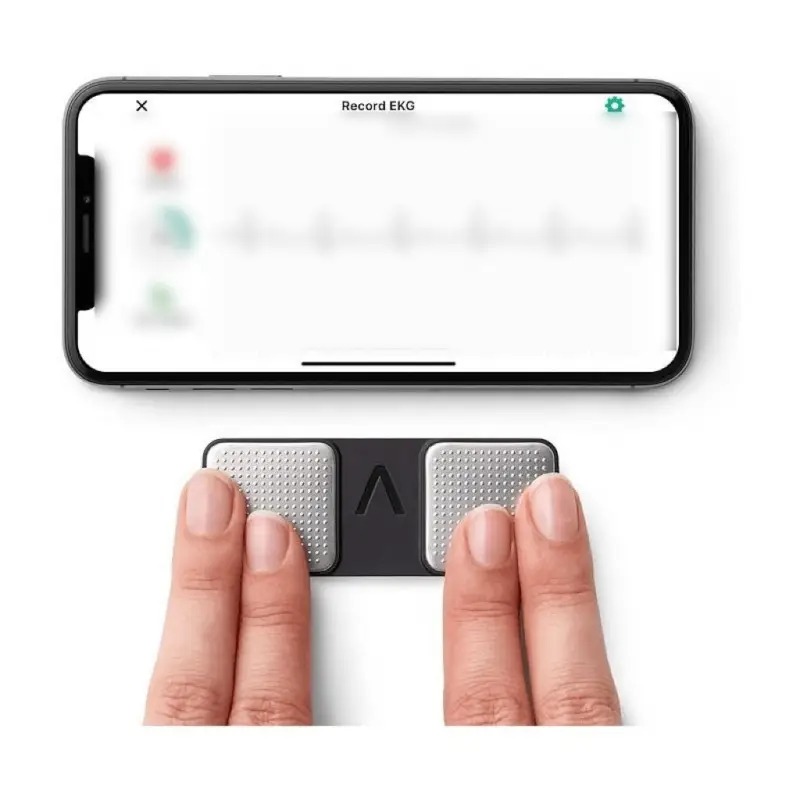 This personal ECG monitor is a compact device designed for convenient heart rhythm recording using a compatible smartphone. The device connects with a mobile app to display real-time ECG data and store recordings for review. Its portable design allows users to take quick measurements by placing fingers on the sensors, making it suitable for home use or travel. The lightweight construction and simple operation provide an easy way to monitor heart rhythm activity and track readings through the connected mobile application.