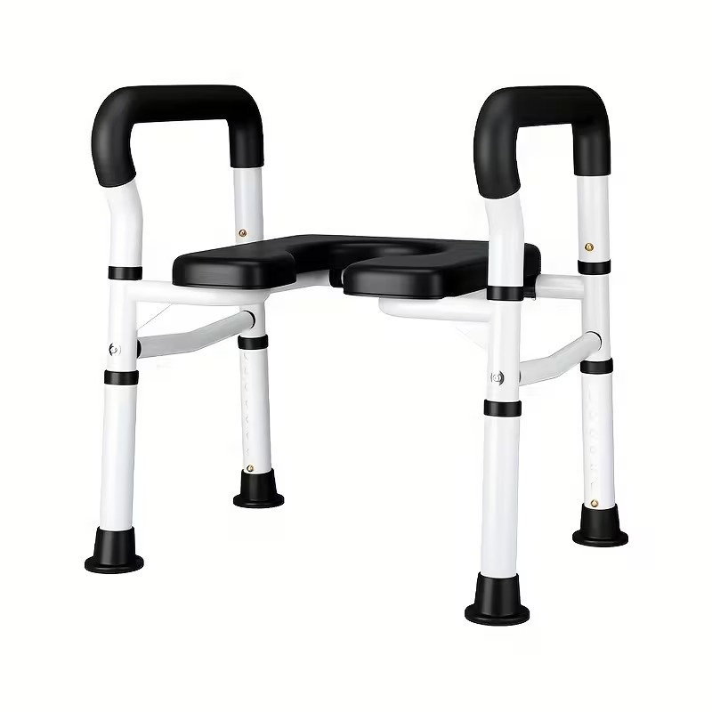 This toilet safety bar is designed to provide stable support and added confidence during sitting and standing in the bathroom. The freestanding frame features adjustable height settings to accommodate different users and toilet setups, while the padded armrests offer a comfortable grip during daily use. Its open-center seat design allows convenient access, and the sturdy non-slip legs help keep the frame securely in place. Suitable for home care, recovery support, and everyday mobility assistance.